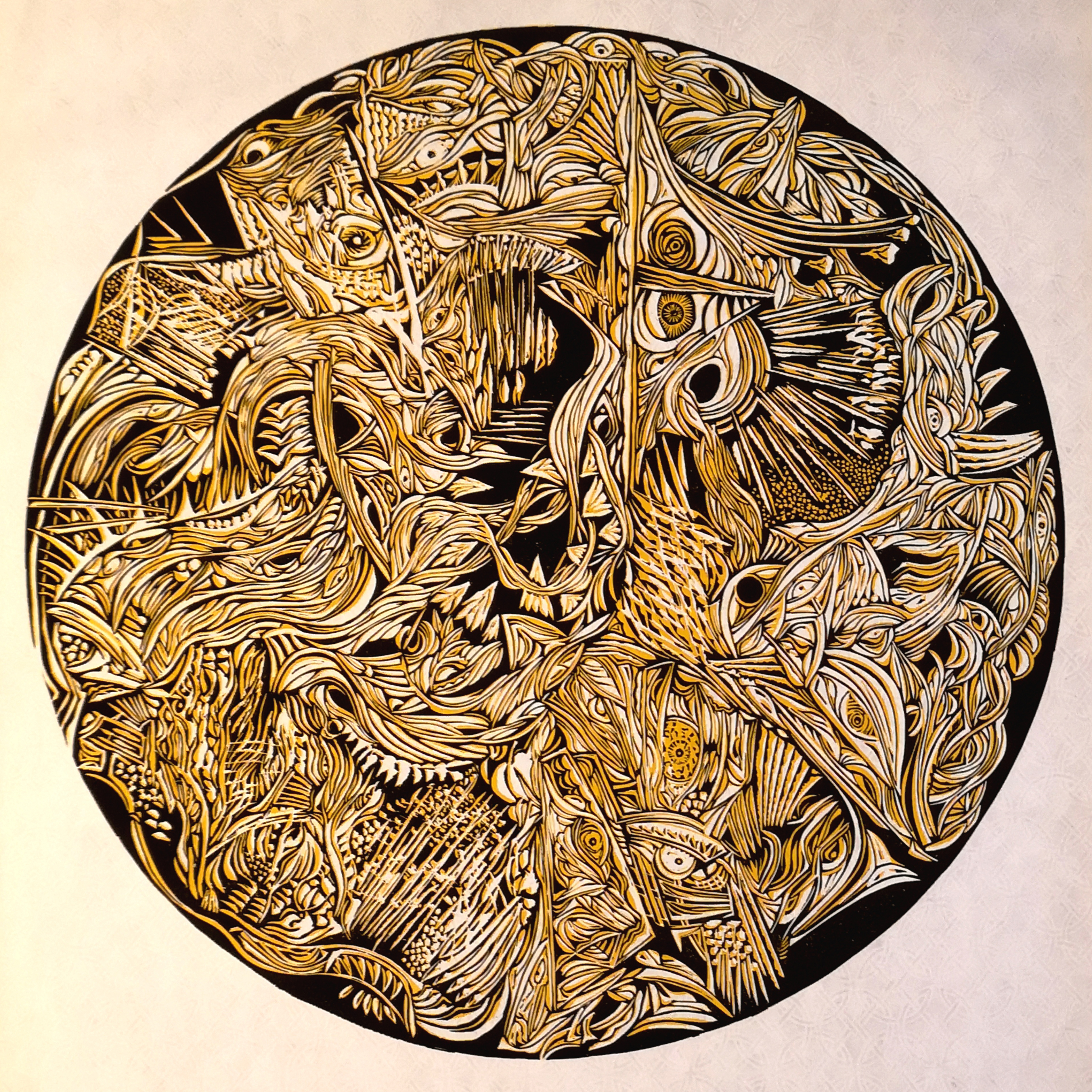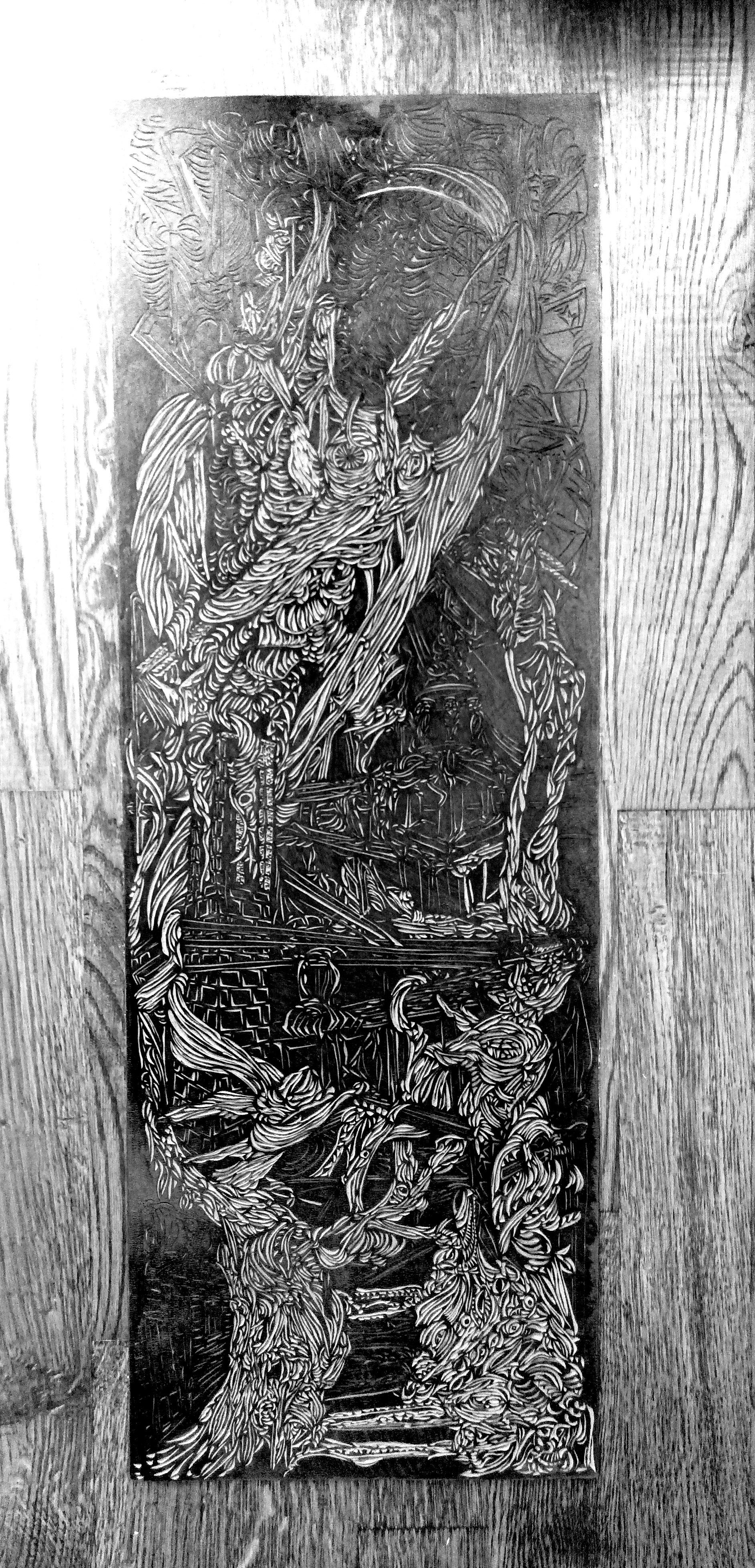 GRAVURE Gravures sur lino, à plaque perdue, l'une finie (8 exemplaires), l'autre en cours (première pass faites, deuxième en approche)